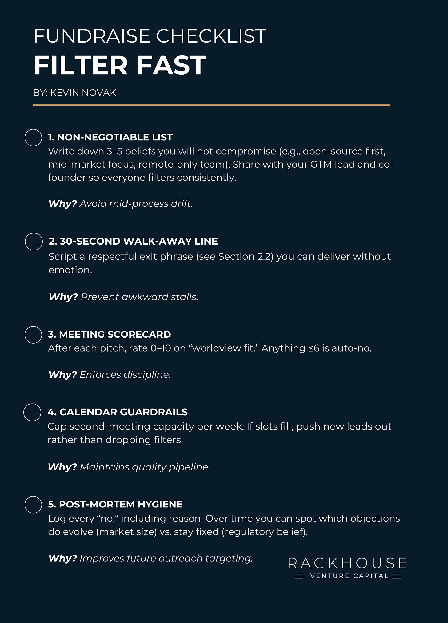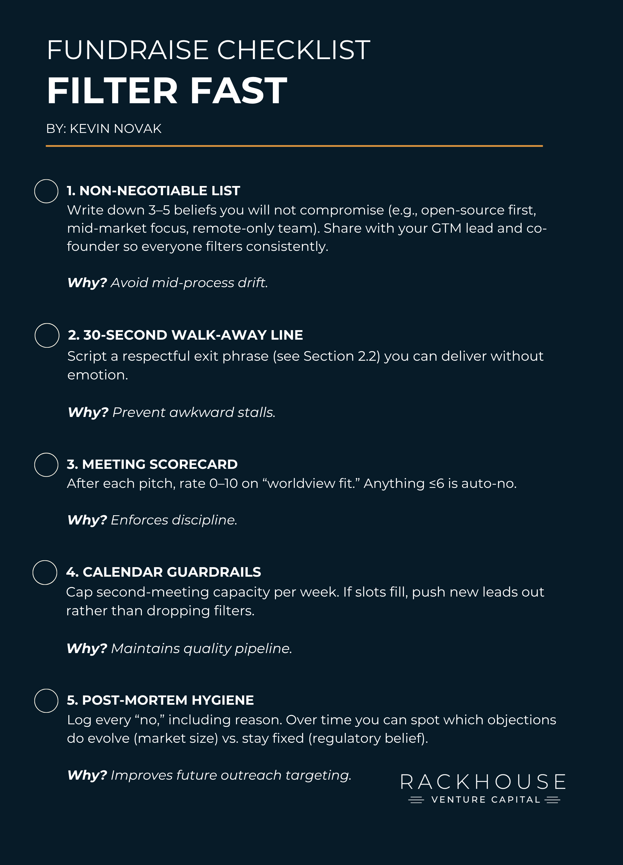 If that feels abrupt, remember: venture is a repeated-game industry. A graceful “not a fit today” preserves the relationship for future rounds—when your traction may shift their priors without you saying a word.