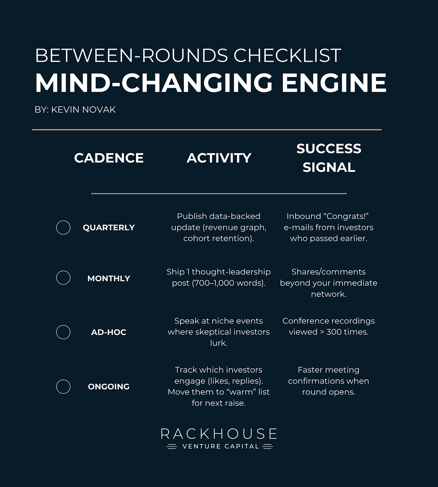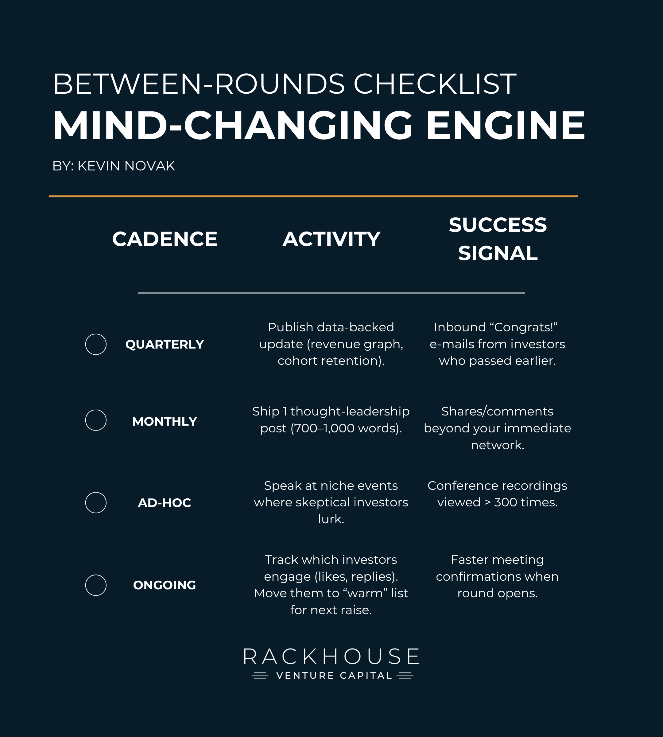 Every update or milestone plants a seed: maybe the founder’s contrarian thesis is right. By your next raise, many of those skeptics have already shifted to “curious” or “pre-qualified.”